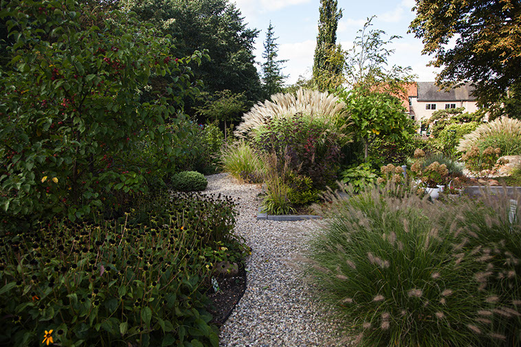 Klassieke plantentuin met veel siergrassen bij appartementencomplex
